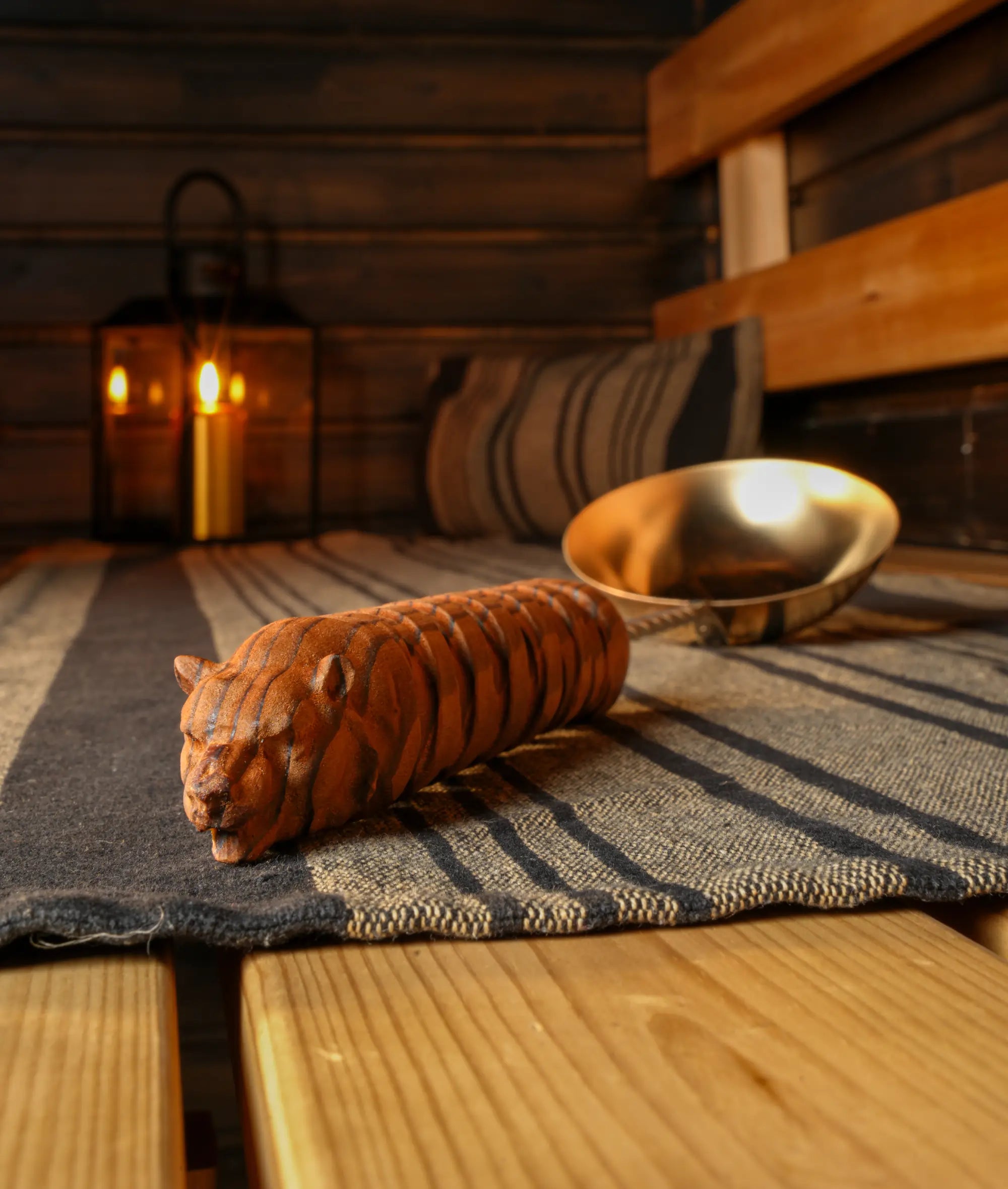 Tuotteiden puiset kahvat on tehty suomalaisesta lämpökäsitellystä männystä - kestävästä ja kauniista materiaalista joka tuo saunaan luonnollista arvokkuutta. Löylykauhan kuppi valmistetaan lämpövärjätystä ruostumattomasta teräksestä, joka yhdistää kultaisen sävyn näyttävyyden ja ruostumattoman teräksen erinomaiset käyttöominaisuudet. Kauhan päässä komeileva karhu, tuo metsien kuningas, kuvastaa suomalaista luontoyhteyttä.
